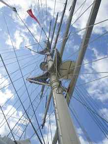 The sails were hoisted by the crew with hydraulic assistance, a couple of times passengers were allowed to hoist a sail manually to get a feel for how hard the work was. There was a trip to the first crows nest on the fore mast, which was a very sanitised experience, guaranteed to be safe and free of litigation for the ship.