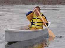 Then my brother joined me in the boat. His added weight brought our total to 450 lbs, and I don't think I'd want to go much higher in this boat, mostly due to cheap plywood and fragile construction. The hull form itself will probably take more load, since we had maybe 6" of freeboard to spare and it paddled easily enough. (Note that the polyester joints didn't complain at all!)