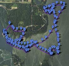 Second, this software will work with any map image, even with a scanned fishing map or topograpic hiker’s maps. You only need to be able to find points to calibrate to. I guess the best way to do this might be to find some clearly identifiable single-point locations on your map, then go to them and mark waypoints on your gps receiver. I suppose you could write down the coordinates too, but why not make the receiver do the remembering for you? Intersections and the ends of bridges are probably simplest. (I didn’t think to mark such points while I was at Rend Lake, so I can’t demonstrate this particular feature with this track.) Do however keep in mind the age of the map, as roads can be re-routed and shorelines can erode over time. If your map is correctly proportioned, two points will suffice. A third point will correct for stretch or skew in your scan, and a fourth will correct for any “fanning” distortion.