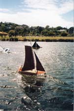 When my Starlet, still unnamed was complete, Roy presented it to me and added “It’s got all the bells and whistles’ to which I replied “That’s it Roy ! BELLS AND WHISTLES it will be !” With her tan gaff rig sails of Jeparra cotton she looked resplendent on the day that we officially launched her at Onepoto, and he had carved out of balsa and beautifully painted an Ancient Mariner helmsman with the name of Charlie Breeze which he insisted “even looks like you !”