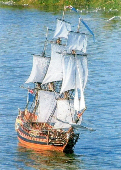 With two drum winches to operate the braces on the main and foresail yards, the rudder is worked from a servo on the third function. The most impressive figurehead was carved from lime, then the grain filled and the figure painted with oil pant. In itself it is a work of art.