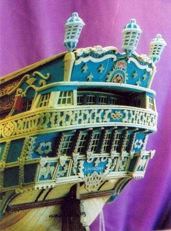 The beautiful stern galleries were a difficult task, all built up traditionally, the windows with real glass panes. The carving work on the whole of these galleries was done in white sycamore onto a blue background. All cannons are of turned brass and a small lathe was deemed essential as there are 74 of them aboard. The ship’s boats are clinker built and represented the most painstaking of tasks as they are open bats visible both inside and out and were made upside down and planked.