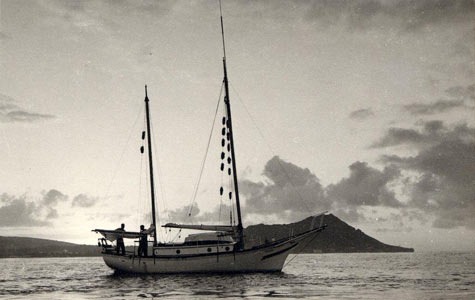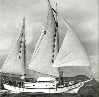 The Golden Rule is believed to have been built in Costa Rica and freighted up to San Pedro, California for outfitting. Designed by Hugh Angleman she is an Angleman 30. Hugh is famous as the designer of the Sea Witch class and the boat is a `Baby Sea Witch’. Interesting to note that the Sea Witches did well from 1949 to 1951 in the Transpac Races from California to Honolulu winning the 1951 race on corrected time.