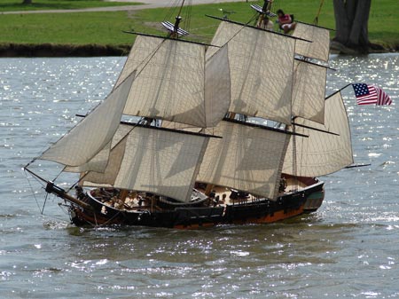 The cannon-firing frigate’s owner `Captain Raymbo’ (alias Ray) has switched hobby interests to garden model railways. Dan Lewandowski of Minnesota whose period schooner Syren featured in the sea battle with Surprise, says he is sorry to hear of the sale and will miss their occasional battles on the water.