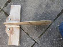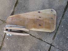 Adding a fin. My main problem in adding a fin was not working out how to do it. It was working out which of the million and twenty ways I could think of doing it that I was NOT going to use. There are two basic ways to add a fin that are relatively easy - attach it to the side or attach it to the transom. Attaching to the side requires a method of clamping and a method of making it parallel to the direction of travel (a wedge). Attaching it to the rear requires a right angle join and a method of clamping. To make things complicated I decided to make a removable transom clamp with a pair of 14 inch by 5 inch plywood scraps with a bit of shaping and a triangular lump of wood 14 inches long and 7 inches wide at the bottom that I shaped roughly and wrapped a bit of fibreglass round to stop it from bowing. As you can probably see from the pictures a pair of cup head bolts and a some Prince Charles nuts (AKA wing nuts) serve to make an admirable connection - you will note the small section of wood above the bolts between the two plywood plates roughly the same thickness of the transom designed to keep the plates parallel while clamping onto the transom.