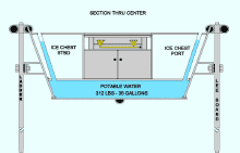 The center section is divided into a 35 gallon fresh water tank that uses dual hand pumps to access the water it contains, twin ice chests, a propane locker for a composite tank that fits right in and a small storage cabinet underneath my self-built dual burner cooker. Why twin ice chests? In the past I have carried two ice chests on week long cruises with one holding ice and beverages while the other holds dry ice to keep meat frozen until ready to thaw and cook. I can only stand so much Beef Stew. The ice chests are insulated but still help keep the water cold. Remember this is drinking water…not ballast. The largest body of water near me is Pamlico Sound where the water varies from salty to brackish to fresh so carrying drinking water is a good idea.