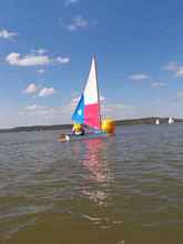The picnic sail on Friday was a ripping great adventure for me and my Bolger Zephyr, the "Rampant Goose," a 20'3" long by 3'8" wide, lateen rigged, flat bottomed sharpie. (My family crest allegedly sports a rampant {in the heraldic sense} goose, standing on one webbed foot with the other leg raised and wings outstretched. I'm really not trying to masquerade as a mutant PDGoose!)