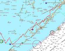 About an hour and a half later he woke me and said he wasn't sure where he was, but that land was approaching. The GPS confirmed the nearness of mangrove islands, but was zoomed in too far to show exactly where Indian Key Pass was. Zooming out produced a pleasant surprise. The wind had backed to the north, and John following the change had brought us in upwind of Indian Key. No tacking would be necessary. Mangrove islands here run WNW to ESE so at a cost of almost no additional distance we had gotten upwind of our destination and could ease the sheets to run down. Even better, we could go north of Indian Key and eliminate tacking up the first mile of the channel.