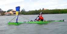 It was a fun run, sliding through bridges, looking at the passing condos and fancy waterfront homes. We only saw a couple powerboats all day out in the wild winds. At one point, Hammerstroke (Will Schaet) slid by in his Class 1 kayak with its downwind only sail, using his paddle to brace in the following chop. He apparently stopped for a break just ahead of us, because a few minutes later, he passed us for the second time. Got better pictures that time.