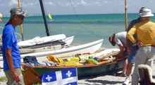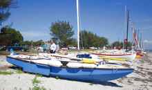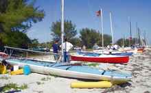 We got to Ft. Desoto on Thursday and made sure to get a good night's sleep. On Friday, we sailed Oaracle from the park's launching ramps to the starting beach so John could get a feel for the boat. Robert Terry from Bradenton, a future hopeful EC participant who would store my pickup and trailer for us during the race, also came along. It was John's (and Robert's) first time on Oaracle and the first time I had sailed to the start rather than taking the boat to the beach on a trailer. There were light winds at the ramp that freshened as we sailed along and provided an exhilarating broad reach by the end of the sail. We beached and with some help hauled the boat above the high water mark.