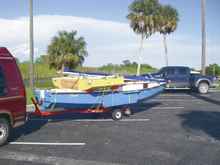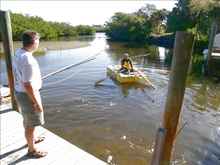 I arrived in Key Largo and checked into the wonderful little Pelican resort right next to the Bay Cove Motel. There were a lot of people to visit with and a lot of discussion going on about the difficulties of this year’s Everglades Challenge. After awhile, I felt the call of the beautiful waters and the nice wind and found myself launching ECduck for some more sailing. I had it in my mind to sail out a bit and meet some of the watertribers coming in. However, my hands still hurting from hauling on ropes quickly eroded my determination and I asked and got permission to park ECduck on the finish beach. I admit, it was kinda fun to see the amazement on people’s faces as they sailed up to the finish line only to see the ECduck had beaten them! I was quick to tell them it only had because it came half of the way by road. Lugnut and Crank came in on Oracle around midnight and I helped them check into their room and left Lugnut to his ritual of packing up the boat.