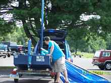 The breeze died as he returned to the ramp. Notice that classy emblem on his sail! |