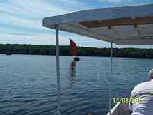 Once Steve caught on to the personality of the Yamaha we were quickly out and beyond Jack and Tom. We headed down the lake for while, with the Yamaha pushing us easily at 3 – 4 knots at 1/3 throttle, even with Steve at the helm and me sitting on the bench behind the front deck. It seems like a better match for the boat than the 2hp Steve had had. (That's probably going on my boat.) After 20 minutes or so we headed back East towards the rendevous and to see how Jack and Tom were making out.