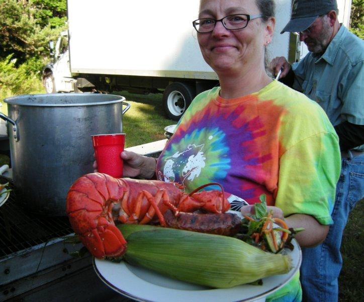 Saturday, the forecast was for modest winds, but as soon as we were in the water, the winds began to pick up. We sailed to Bean Island, had lunch and made plans to explore Young's Bay on the way back. However, the wind continued to build to 15+ knots and each Skipper decided to keep heading for Lamoine, with most under full sail. It was a spectacular run! What a way to end three days of sailing! Lobster dinner was awaiting us upon our return. After we arrived at Lamoine, most boats that came in were beached to await trailering. After about two hours, most of the boats that were not moored for the night had been pulled out of the water on their trailer and set in the trailer yard for pick-up. It was a marvelous choreography to watch and in which to participate (I took several turns cranking the winch). Afterwards, the lobsters were definitely calling us. |