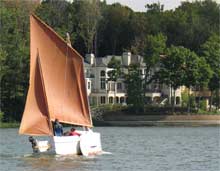The Terrapin is not good at planing, though reaching in a strong breeze she will exceed hull speed. It does not at all throw her off balance. She surges and slows, surges and slows, in powerful gusts, without changing course. Balance is little affected by variation in wind strength.