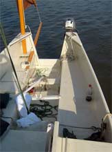 On the other hand, if the breeze freshens over ten knots, the Terrapin close-hauled seems all at once to achieve true self-steering equilibrium, truly comes into her own, loving the wind and chop, and moving ahead with a smooth power that reminds me of the cleanness of a multihull. She rolls over on her chine, lengthens her waterline, and her slab side and bottom present a very quiet right-angle vee to the nastiest whitecaps.