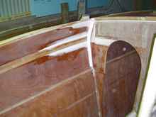 Apply the first layer of uni directional carbon fiber. Fan these layers out as shown. The strands go from the outside to the inside in the same pattern and length. The u.d. strands have to be fanned out as shown. This way the load is distributed evenly over the hull.