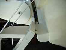During previous discussions on this topic, & especially since I posted a whole heap of photos on Duckworks forum, I sensed that the over-riding concern of intending builders was how the hinges were arranged so that the folded ladder ended up neat & flat against the transom. I hope I have answered this here.