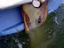 | The new leeboard cuts through the water. |