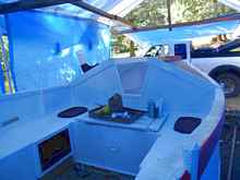 Now I just had to wait for better weather and it came in April however the social secretary had decided that we needed a holiday and that driving down to Palm Desert and back would be just the ticket so April was out. May came but I was on call for most of it so not able to launch any boats. I had a window of opportunity at the end of May and took advantage of it and on 29 May 12 into the oggy she went. That's my favourite small sailor directing operations from amidships. She came off the trailer with no problems and settle right to her lines as drawn.