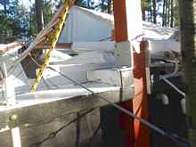 I must admit that this latter creation may have been a tactical error on my part. To remove the main mast you first lift up on the mast to clear the step. The upright edge that you see is about 3” and the mast fits very tightly in the tabernacle, it's not as easy as I envisioned. Nor is it as easy to haul the mast upright as I calculated. But inventive minds find ways, in this case an 8 to 1 haul system, white lithium grease and a strong son-in-law.