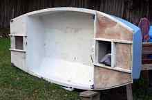 The pictures tell how the repair was accomplished on a section of the hull. First, the hull was propped on its side and the affected area was made as level as possible. You don't have to use a spirit level, but get it eyeball close.