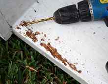 Next, I use a drill to punch a series of closely spaced holes on the affected area. You should be able to feel the damaged wood. I try to drill holes right to the border of the infected area and a little over into good wood. Try not go drill through the wood, which can be a little tricky when, like the Piccup, the hull is made from ¼-inch ply. In this case, the affected area is backed by the rubrail, so there's little worry about going too deep. If you do go through an unbacked area, cover the bottom side with tape so the eventually applied epoxy won't drip through. As the picture shows, much of the top layer of the ply will simply flake off. Don't worry about that.