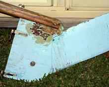 | A quick and ugly repair of a rotted area on the rudder, but surprisingly strong. It kept the boat usable while a new rudder was made. |