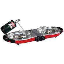 If you believe that you must have a two-burner stove, the new Coleman Fold n Go stove is just the thing. It's about 25% more compact in size compared to traditional 2 burner stoves. It's easy to carry, and simple to store. Folds out into two full-size cooking areas. Has two 10,000 BTU burners. Regulator and cooking grates store inside stove when not in use. Burners are adjustable from low to high cooking heat. InstaStartT gives fast, dependable lighting without matches. Operates on standard 16.4 oz Coleman propane cylinder.