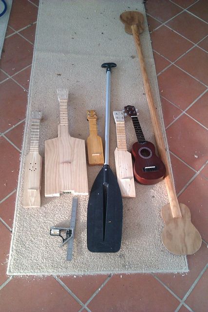 The inspiration for this was the number of times I have seen people who have home made paddles strumming at them like some mad air guitar king. Then when I was in Vanuatu I saw the locals playing their home made local variant of the tahitian ukulele. A little bit of experimentation and not a large amount of money later I was the proud owner of a large number of ukuleles made with my own hand. The collective noun for ukuleles is of course a happiness of ukuleles. (I just made that up).