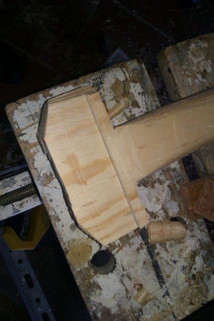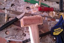 I rebate planed out some of the original wood so I could laminate in some wood in with the grain in the strong direction. Note the potato peeler that I was using as a finishing spoke shave on the shaft and the Victorinox shaping knife I bought at a kitchenware store.