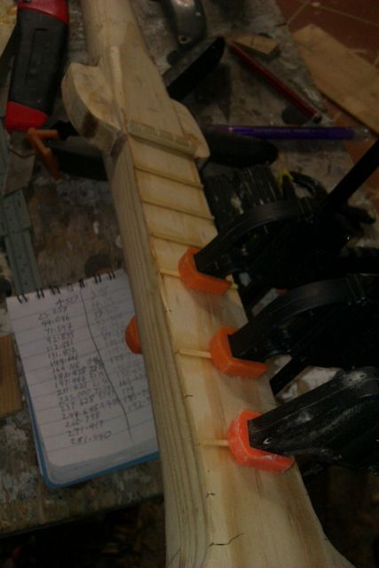 Take off the machine heads – do a little bit more fine tuning on the shaping of the headstock area to get the fit just right and rasp and plane and sand and sand and sand. Now might be a good time to add fret markers – usually to the 3rd, 5th and 7th frets. At the moment I have some light pen marks. Next time I go down the beach I will have to look for some nice abalone shell. The white shells I had in my collection just would not have stood out against the pine very well.