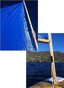 Setting up a boat is always a chore. With the WEDGE Sail, I tried to make things as simple as possible. The Mast and Boom fold in half for storage, and are easy to unfold while on the boat. There are no shrouds to contend with. When the sail is down (as shown), the boom is held up by a boom-line. The halyard runs up the mast, through eyes, so raising and lowering the sail is an easy task. Velcro straps should be used to secure the lowered sail to the boom.