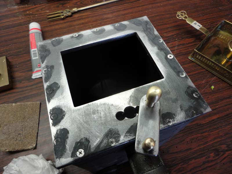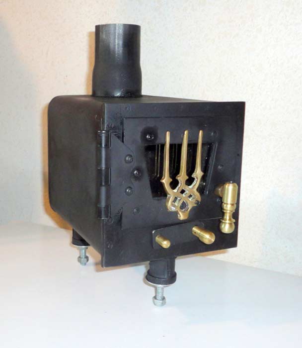I used an anchor nut locked even tighter with a castle nut as a latch. A decorative brass handle made from another thrift store find is on the other end of the bolt. The gasket is glued on with a special wood stove gasket glue that is clear and looks like model cement. I painted the stove with flat black Tremclad high temperature paint.