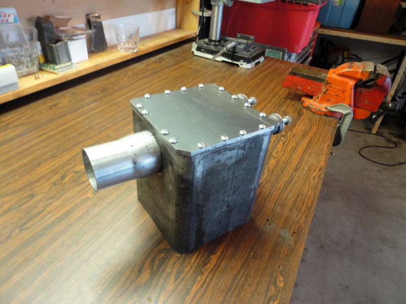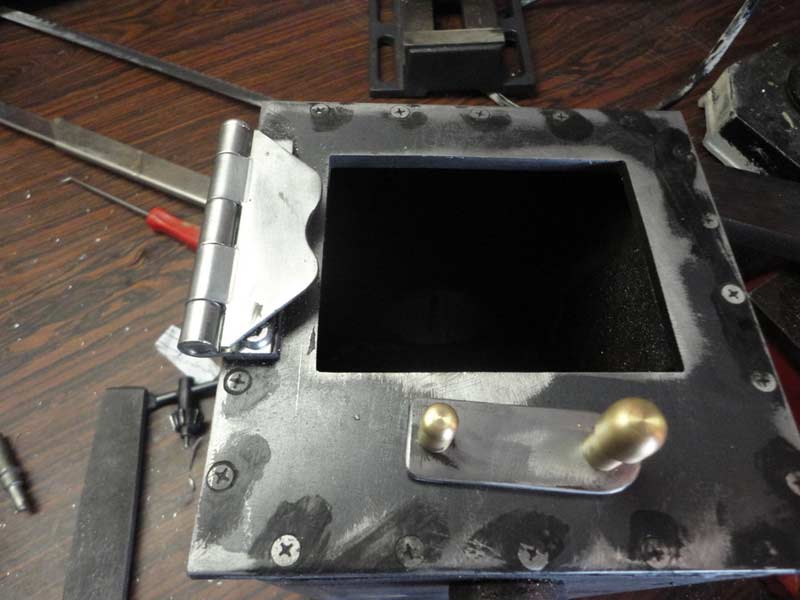 Next I made the back of the stove with a six inch by six inch piece of ¼ inch mild steel plate, and drilled and tapped to accept 10-32 machine screws to bolt it on. Before doing so, I smeared on copious amounts of stove cement to seal it.