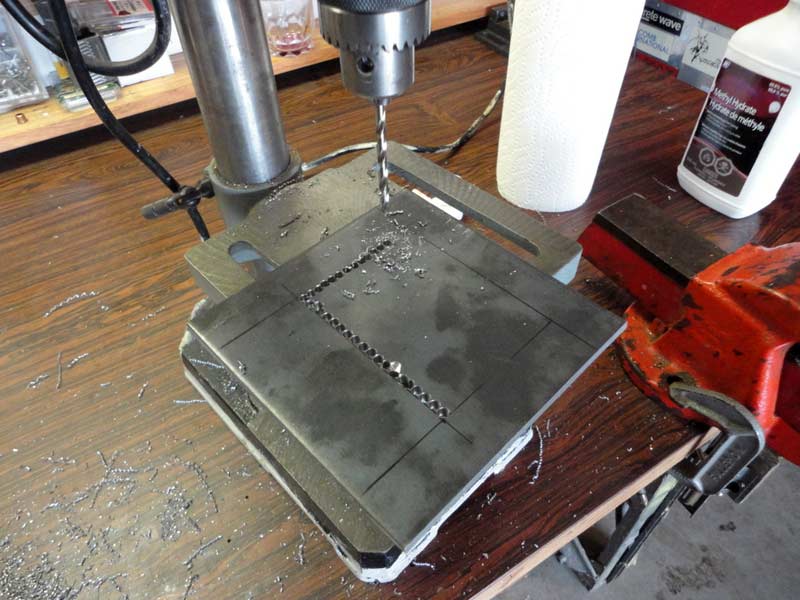 | Next I made the back of the stove with a six inch by six inch piece of ¼ inch mild steel plate, and drilled and tapped to accept 10-32 machine screws to bolt it on. |