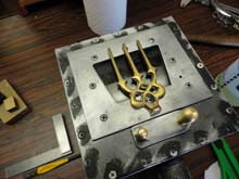 Here you can see the draft control I made. The knob on the left is made of a piece of brass drilled and tapped to accept a 6-32 screw which is installed in a countersunk hole from the back of the piece so it can slide across the front easily. The right knob is drilled and tapped for a 10-32 screw that protrudes from the inside of the stove though a tapped hole. To adjust the draft I loosen the right knob and move the control to the desired position, and then tighten.