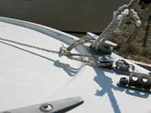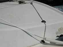 To make handling the jib easier I added a downhaul. In 2010 I did not have a downhaul for the jib and had difficulty when trying to bring down the jib in a narrow channel. One of the hanks jammed on the forestay and I was unable to go forward to fix the problem. My downhaul for this year was rigged by attaching a small block on the bow and running a 3/32" line thru two small fairleads to the cockpit. The end of the line I attached to the hank near the head of the sail and ran the line through the other hanks. This system worked very well when we needed to get the jib down, especially in the high winds we had. It kept us from having to get on the fore deck. Pulling the jib sheets tight kept the sail on the deck until we could get it secured.