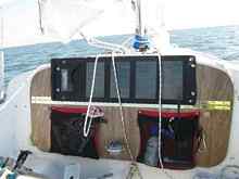 2x4's with 1x4's to reduce weight. With the legs folding to the outside I could tie a line between the legs to lock them in place. For this years' event I had planned to use a tent and sleep on shore, but wanted to carry the boards just in case I wanted to sleep on the boat. Last year the boards were stored in the cockpit while under sail. This year I decided to store the boards in the stern with straps. I added strap attachment points in the stern on each seat. I placed the boards across the seats in the stern creating a rear deck area similar to a Day Sailer I. On one of the boards I place four screws with wing nuts to the underside. These screws would face up when the boards were folded. I attached a 5W solar panel to the boards. This panel went to a rechargeable battery pack (secured below the boards), which was connected to a small electric cooler. The panel itself could not power the cooler, but running through the battery it ran very well. We did not use the cooler much as planned however. The panel was used for recharging the VHF radio. As a further refinement of the bed boards, I plan to make two separate boards, the length of which will be equal to the width (about 4-feet) of the cockpit in the stern. The legs will fold the same as current modification. With two separate boards I can have sleeping surfaces on each side of the centerboard trunk. I can get enough extra length by using the rowing seat up against the cuddy cabin.