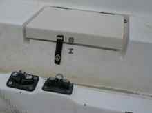 On the inside of the cuddy cabin I added some harness staples to use as attachment points for straps to secure some items that I didn't want to bounce around. The last item I made was a cover to protect the centerboard control lines from everything being stored in the cuddy cabin. The last thing I wanted to occur while on the trip was for equipment or provisions to cause the control lines to jam. A cover also allowed us to not lose much needed storage room in the cuddy cabin. To make the cover I bought a small plastic foot stool from Home Depot. I cut the legs down enough to cover the control lines. I drilled a couple holes in it to tie lines to hold it in place.