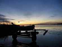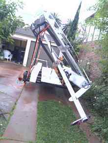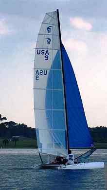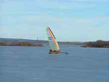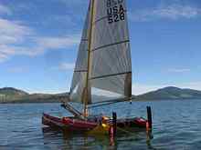 My regular perusal of catamaran classifieds turns up an 18 square ridiculously cheap in San Diego. A class racing boat from the 80's, it's 18 feet long, 11' wide, with a monster mast, 35' tall. Another light air machine. That lust that I seem so susceptible to, develops once again! I surely don't need another boat, but this is one I've eyed for years, and here was a great opportunity to see if it'd be as much fun as I had imagined. So I scan about for a partner. Not that hard to find. My regular crew and landsailing/iceboating guru, John, has been thinkin' that he might be needing a cat of his own so he doesn't have to drive that 10 minutes south to fly with me. He ponies up the purchase price, and I arrange and finance the craft's journey north. Yippeeee! A new toy! John hacks up a boat lift to adapt it to the wide beam, and she has a new home in Lakeside. I now have a ride there at mid lake, Flight Risk 10 miles further south at the cabin in Rollins, with High Voltage on Dayton Bay another 10 clicks to the south and west. Which is the bay with the magic wind!