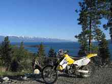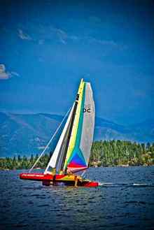 My usual summer visit to Minnesota, and it's week of sailing Adam's A cat on Lake Minnetonka, and a day or two with the Fleet 444 catsailors, gets transmuted into a glorious 9 days in Rollins with Kathy. Of which I snuck in 8 days of powered up sailing under gloriously sunny summer skies. With 4 cats scattered along the shoreline, if there's a breeze somewhere, it'll be exploited. It's my job! If I can't see pressure from the hill just above the cabin, I'll fire up the DRZ and climb a couple thousand feet to get a good view of the lake, north towards Lakeside, and south to Dayton and Big Arm bays. And what a vista! Flathead Lake is 28 miles long, north to south, and 15 miles wide from Elmo to Yellow Bay. Clear, deep blue water, with the rugged Mission and Swan ranges to the east, and rocky, coniferous shores, which often reminds me of Superior. A magnificent sailing playground for a fellow like me!