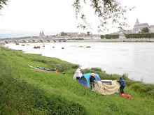 Arriving in Blois, we immediately set about launching a canoe (Victor? Or what it Hugo? We never were quite sure which was which), Peter's kayak and Albert's skiff. Our goal was to find an amenable, sheltered spot on the shoreline to camp for the night before setting out on the river the next morning. Our launch spot was a small park directly opposite the town of Blois with terrific views of the town Chateau, towering Cathedral and a plethora of traditional French boats known as "futreaus".