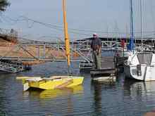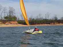 I decided to do the first launch of the duck in Lake Allatoona, a 14,000 acre lake northwest of Atlanta and only minutes from my home. I had the launch ramp at Harbortown marina all to myself as I rigged the boat for the first time. No, I didn't sail the pavement on my driveway but rather trusted that I got the mast step and boom right and that all the parts would fit together. For the most part they did though the boom proved to be a little short. No big problem as I could simply roll up the rig sail a little using the around mast furling. The list of needed improvements did get its genesis on the launch ramp but I did get the boat in the water and it floated - always a big plus! Don't laugh, I remember a gentleman in Norway that lovingly restored a lap strake motorboat and then invited all his friends and acquaintances to a big launch party. Evidently, no-one with experience with old lap strake boats were among his friends otherwise they may have told him launching one of those boats after it has been out of the water for a while is a slow multi-day process to allow the wood to swell. Low and behold, after a speech, breaking of a Champaign bottle on the prow, the proud skipper climbed on his boat and rode it down the slip into the water ... and below the water. Seeing this left an impression which is why I am glad when my boats float when first launched, don't tend to invite people to the first launch, and prefer no witnesses to be around at all.