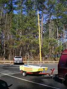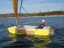 So, this article begins with me hoisting Knot Yacht, a self-designed and built 12' speedster, off of the boat trailer and, with much grunting and groaning, putting my bright yellow boxed shape boat in its place. What a contrast and not only in color. Where Knot Yacht has a sharp bow that easily cuts its way through waves, the PDracer has a broad front transom sure to produce spectacular fans of spray in chop. Where Knot Yacht is designed with an open transom and very little freeboard designed to be sailed on not in, the PD racer has high freeboard and a long cockpit designed to sit and sleep in. Finally, where Knot Yacht has been tested on the waters the, as yet unnamed, PDracer is a big question mark. I carefully strap down the boat, run through a checklist of needed parts (got the mast and rudder), hook it up to the car, and head down to the lake to start getting familiar with this future "vacation" home.