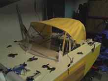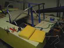 Back at the shop, it was time to turn my attention to making the dodger that would enclose the cockpit providing shelter both when sailing and sleeping. During one of the BEER cruises I did a bit of dumpster diving picking up a dodger and frame that was taken off a large boat. This provided nice aluminum tubing to use in building the dodger. I bent it into a two-bow frame and used some bimini hardware I had around the shop. Once again, I turned to duckworksbbs.com and got snap on/off bimini side mounts which I had used to great effect on my catboat "Little Gem." I used these and some masking tape to prop the frame on the boat.