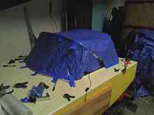Blue polytarp served as scrap material I could make a template out of. The first step in making a dodger.