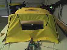 This is when I screwed things up. I decided to sew in a sunroof so I could see the trim of the sail. For some reason, this caused an ugly wrinkle across the top that an additional re-sewing didn't remove. Functionally, the top was fine but aesthetically... I added a back flap that could be closed by zippers and the dodger was ready for testing. Of course, I had some additional tweaks to do to the boat before hitting the water.