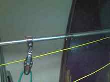 The next tweak was to change the way the reefing line worked so it could be used from the cockpit and the sail could be more easily tightened. Also, I needed to remove the tendency of the reefing line to try and choke me and/or sweep off my hat on each tack. I already had lost a good hat on the first test-sail to this line. I bought some real nice yellow yacht braid line from duckworksbbs. com which arrived later that week and, along with an assortment of pulleys and cam cleats, allowed me to create a single line reefing system along the lines of the original reefing system the Escape Sailboats, from which my mast and sail had come from. Again, I decided not to raise the mast at home but, rather, to test out the changes at the lake.