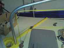 New spliced boom. The yellow line is my reefing line and does not go through the mainsheet block.